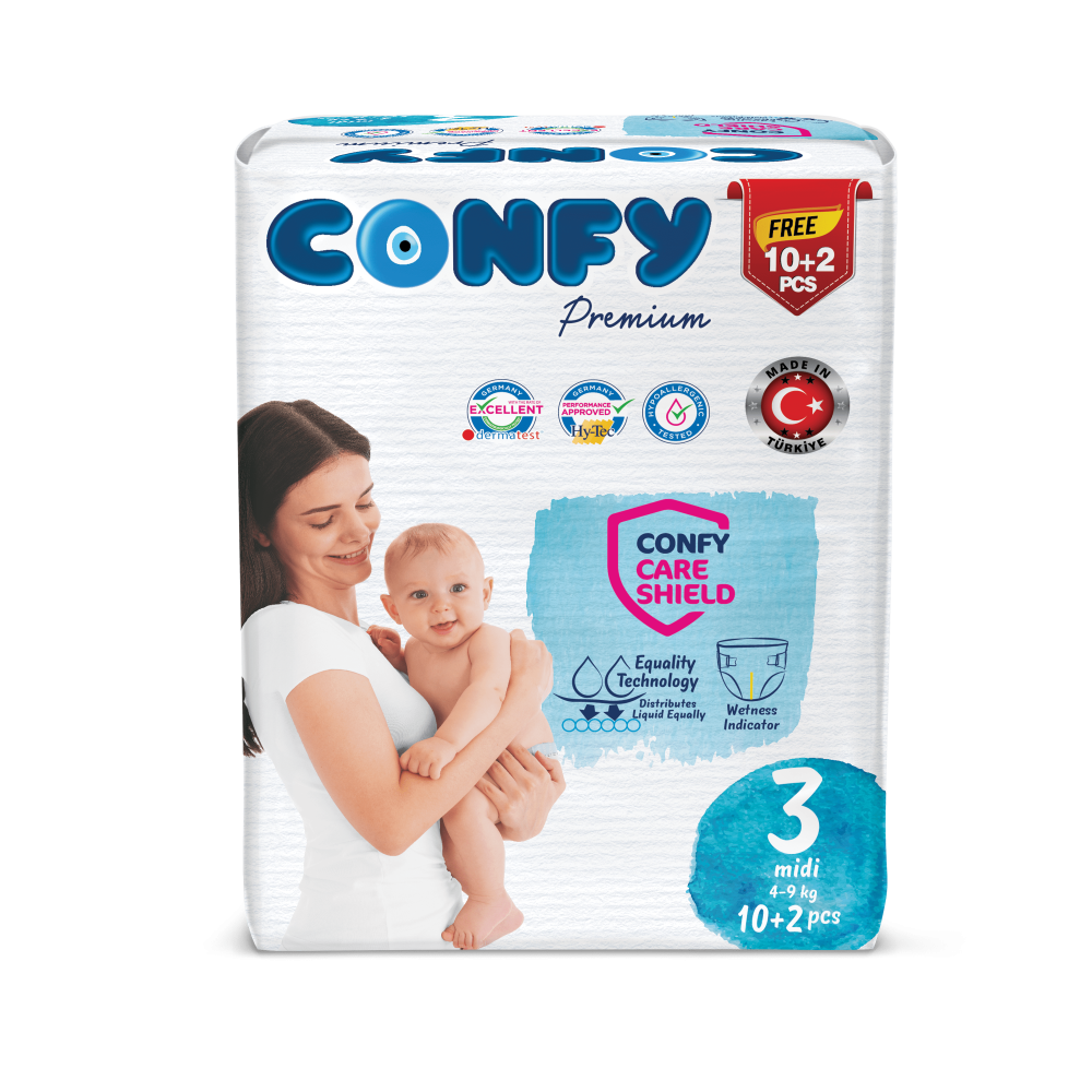حفاضات كونفي بريميوم للأطفال مقاس 3 مزودة بدرع حماية كونفي الغني بالزنك، البانثينول، واللانولين لحماية البشرة من التسلخات.